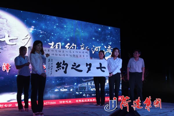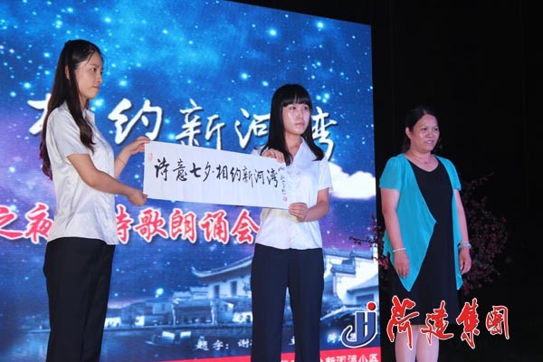 晚會現(xiàn)場,山東省朗誦藝術(shù)家協(xié)會副主席、菏澤朗誦藝術(shù)協(xié)會會長周忠良,全國著名作家石耿立,菏澤市電視臺著名主持人張志勇等朗誦高手紛紛獻(xiàn)彩,為廣大觀眾呈上了一場浪漫而又富有藝術(shù)色彩的文化盛宴。全國著名書畫家謝孔賓先生親自為晚會題下“詩意七夕·相約新河灣”幾個大字,翟永華、谷鶴等多位著名書畫家也紛紛獻(xiàn)上大作,為晚會送來美好祝福。集團(tuán)任永信和李霞同志聯(lián)臺朗誦的《風(fēng)雨菏建人》,贏得現(xiàn)場觀眾的陣陣喝彩。