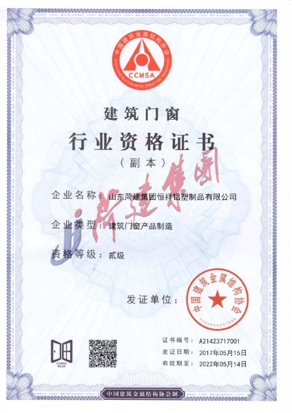 菏建恒祥鋁塑制品公司資質等級成功晉升為貳級資質