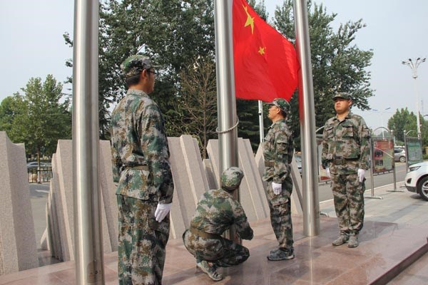 在升國(guó)旗儀式上,集團(tuán)基干民兵身穿訓(xùn)練服,列隊(duì)整齊,在全體人員的注視下,升旗手邁著整齊有力的步伐護(hù)送五星紅旗到升旗臺(tái),伴隨著國(guó)歌的奏響,鮮紅的國(guó)旗冉冉升起,迎風(fēng)飄揚(yáng),現(xiàn)場(chǎng)氣氛莊嚴(yán)神圣。