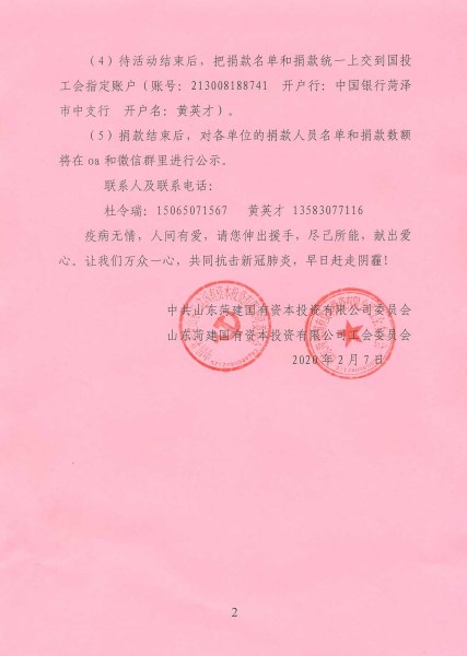 “武漢加油!菏澤加油!我捐500元。”“中國加油!山東加油!我捐1000元。”“我捐200元。”……2月7日下午,在山東菏建國有資本投資有限公司微信工作群中,一場抗擊新冠肺炎捐款活動大幕拉開,公司全體干部職工熱情高漲,積極參與,從董事長、總經(jīng)理,到每一位職工都慷慨解囊,在3天的時間內(nèi)捐款達(dá)16萬元。