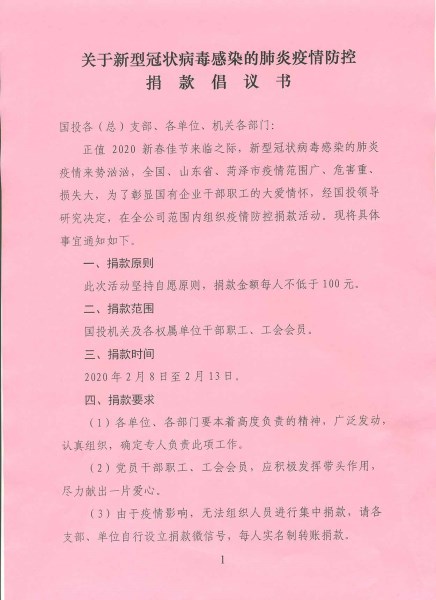 新冠肺炎疫情牽動著公司廣大干部職工的心,聞悉奮戰(zhàn)在抗擊疫情一線的醫(yī)務(wù)人員和各類工作人員防護(hù)物資緊缺的情況后,2月7日上午,國投公司黨委第一時間召開黨委會議,研究決定在全公司范圍內(nèi)組織疫情防控捐款活動,并于當(dāng)日中午通過微信工作群,發(fā)布《關(guān)于新型冠狀病毒感染的肺炎疫情防控捐款倡議書》,各單位、機關(guān)各部門積極響應(yīng),廣泛發(fā)動,認(rèn)真組織,確定專人負(fù)責(zé)此項工作。
