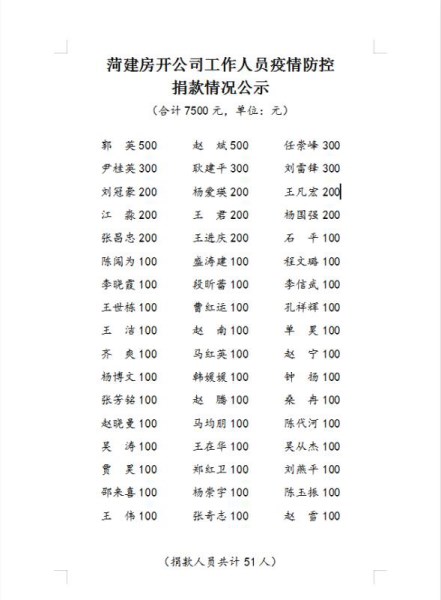 由于疫情影響,無法組織人員進(jìn)行集中捐款,公司各單位、各部門自行設(shè)立了捐款微信號,此次活動堅持自愿原則,每人實名制轉(zhuǎn)賬捐款,彰顯了國企的責(zé)任與擔(dān)當(dāng),詮釋了菏建國投公司全體干部職工的大愛情懷。