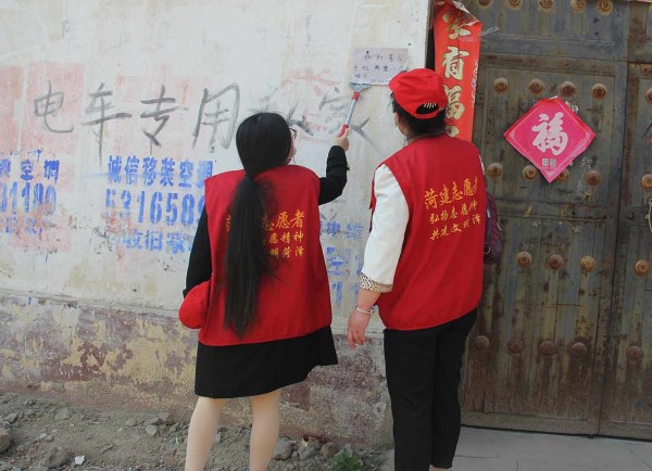 ![]() 菏建志愿者清理居民墻上的頑固小廣告 |