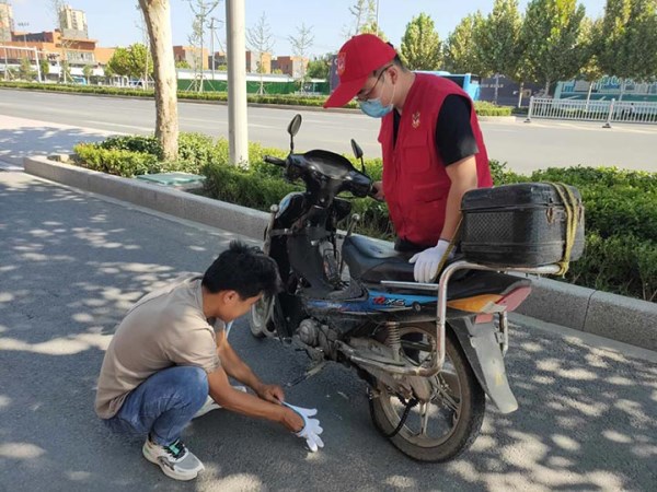 ![]() 菏建國投志愿者幫助市民修理摩托車 |