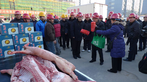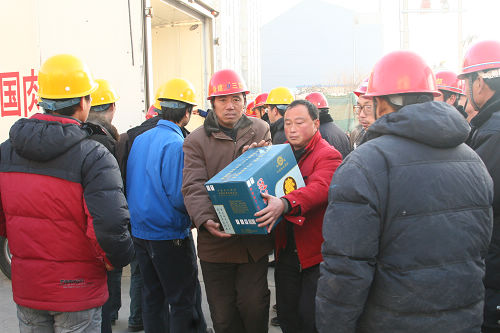 2011年1月1日上午,“元旦”之際,集團(tuán)黨委書記、董事長(zhǎng)兼總經(jīng)理張廣周帶領(lǐng)集團(tuán)領(lǐng)導(dǎo)、各部室負(fù)責(zé)人,先后到市政府(反恐)應(yīng)急中心及公安指揮中心、景岸家園和趙王河新村工地進(jìn)行慰問(wèn),為一線人員送去豬肉、煙酒。