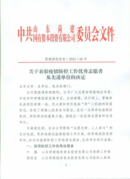 為激勵(lì)先進(jìn),弘揚(yáng)志愿服務(wù)精神,經(jīng)菏建國(guó)投黨委研究,近日,公司對(duì)在疫情防控工作中作出突出貢獻(xiàn)的優(yōu)秀志愿者和先進(jìn)單位進(jìn)行表彰。