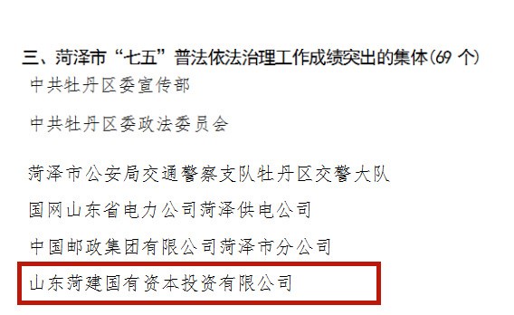 近日,中共菏澤市委全面依法治市委員會辦公室、中共菏澤市委宣傳部、菏澤市人力資源和社會保障局、菏澤市司法局聯(lián)合發(fā)布了《關(guān)于表揚(yáng) 2016—2020 年菏澤市法治政府建設(shè)和“七五”普法依法治理工作成績突出的集體和個人的通報(bào)》,山東菏建國有資本投資有限公司榮獲“菏澤市‘七五’普法依法治理工作成績突出的集體”稱號。