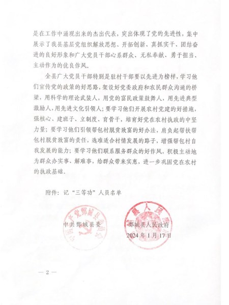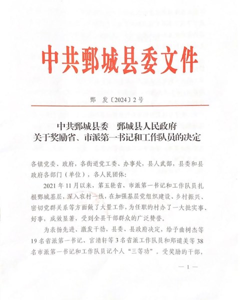 近日,中共鄄城縣委、鄄城縣人民政府發(fā)布關于獎勵省、市派第一書記和工作隊員的決定,菏建國投選派第一書記油愿誠、朱繼剛、李文生等三名同志榮獲個人“三等功”。