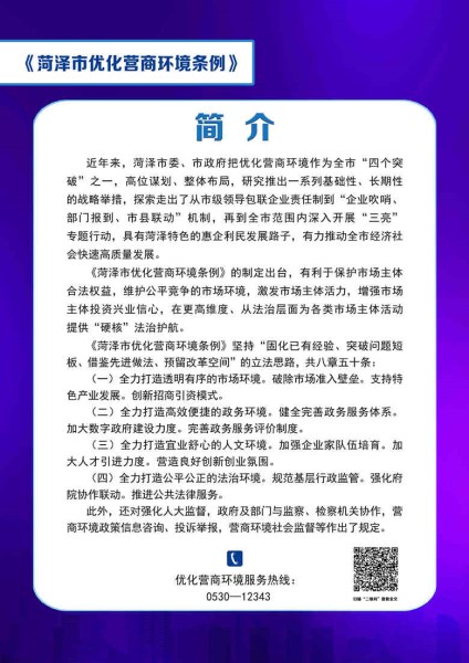 深入實(shí)施《菏澤市優(yōu)化營(yíng)商環(huán)境條例》,著力打造高效便捷的政務(wù)環(huán)境、公平公正的法治環(huán)境、誠(chéng)信守諾的社會(huì)環(huán)境、透明有序的市場(chǎng)環(huán)境