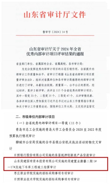 近日,山東省審計廳組織對省屬單位和各市審計局推薦的內(nèi)部審計項目進行了評審,經(jīng)過初評、復(fù)評2輪嚴(yán)格評審,菏建國投申報的《菏建置業(yè)康馨二期1#-17#及地下車庫工程竣工結(jié)算審計》項目,在眾多參評項目中脫穎而出,榮獲2024年度市級單位內(nèi)部審計項目“全省優(yōu)秀內(nèi)部審計項目一等獎”,是我市市級單位唯一獲得一等獎的內(nèi)部審計項目。