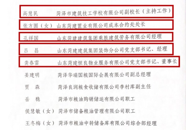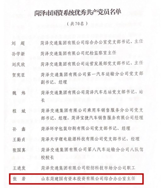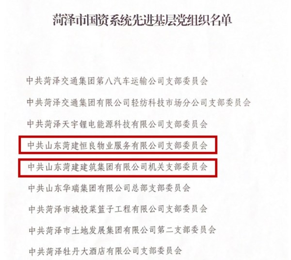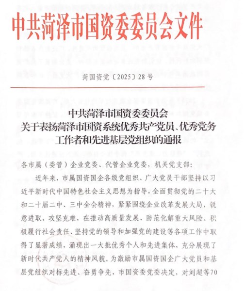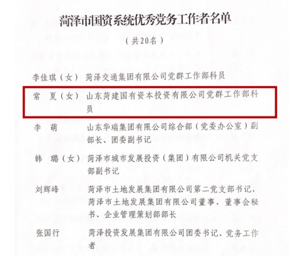 6月30日,市國資委印發(fā)了《中共菏澤市國資委委員會關(guān)于表揚菏澤市國資系統(tǒng)優(yōu)秀共產(chǎn)黨員、優(yōu)秀黨務工作者和先進基層黨組織的通報》,張巖、高慧民、張方圓、孔祥國、呂昌、龔春雷等6人獲評“優(yōu)秀共產(chǎn)黨員”,常夏獲評“優(yōu)秀黨務工作者”,菏建集團機關(guān)黨支部、菏建恒良物業(yè)公司黨支部獲評“先進基層黨組織”。