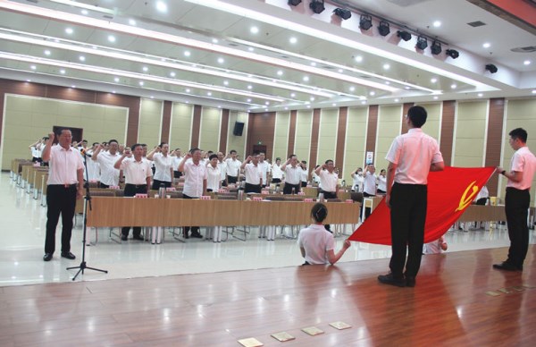 菏建國投黨委書記、董事長蘇紅軍帶領(lǐng)與會人員重溫入黨誓詞