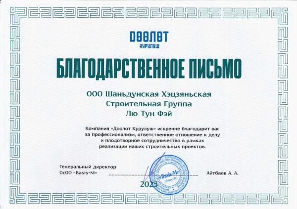近日,吉爾吉斯斯坦Basis-M有限責任公司向山東菏建建筑集團有限公司及公司職工劉同飛同志正式致送感謝信,對其雙方在建筑合作項目中表現(xiàn)出的專業(yè)精神、高度負責的態(tài)度及卓有成效的協(xié)作表示高度贊揚與誠摯感謝。