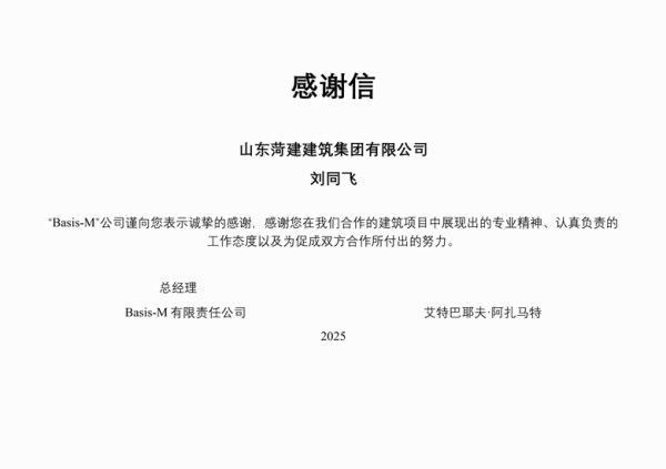 吉爾吉斯斯坦Basis-M公司向菏建集團贈送感謝信 贊譽專業(yè)合作與卓越貢獻